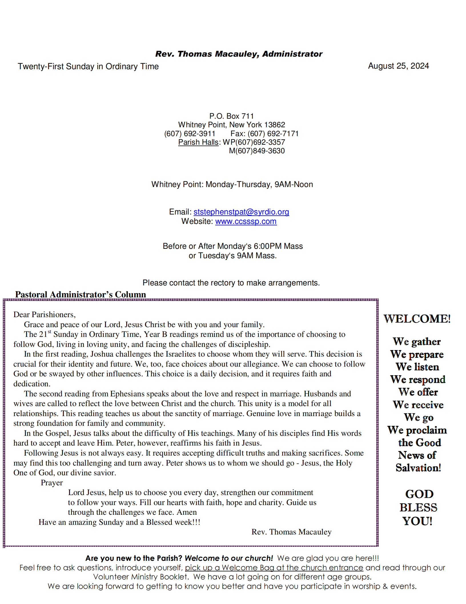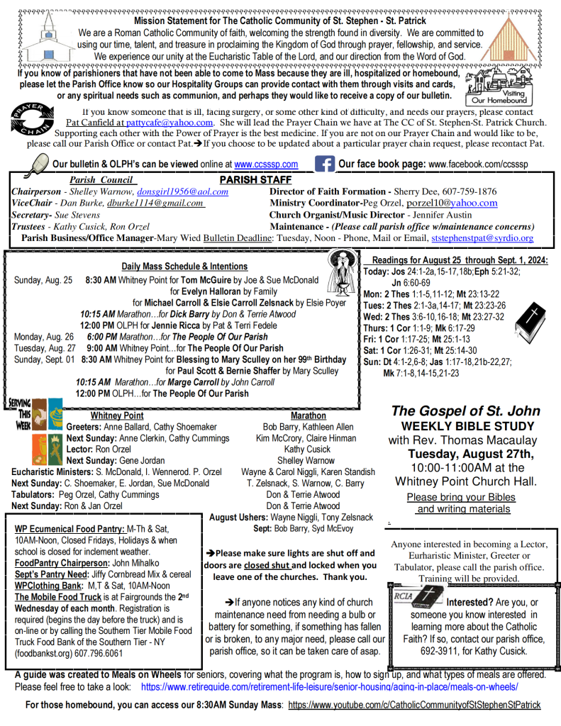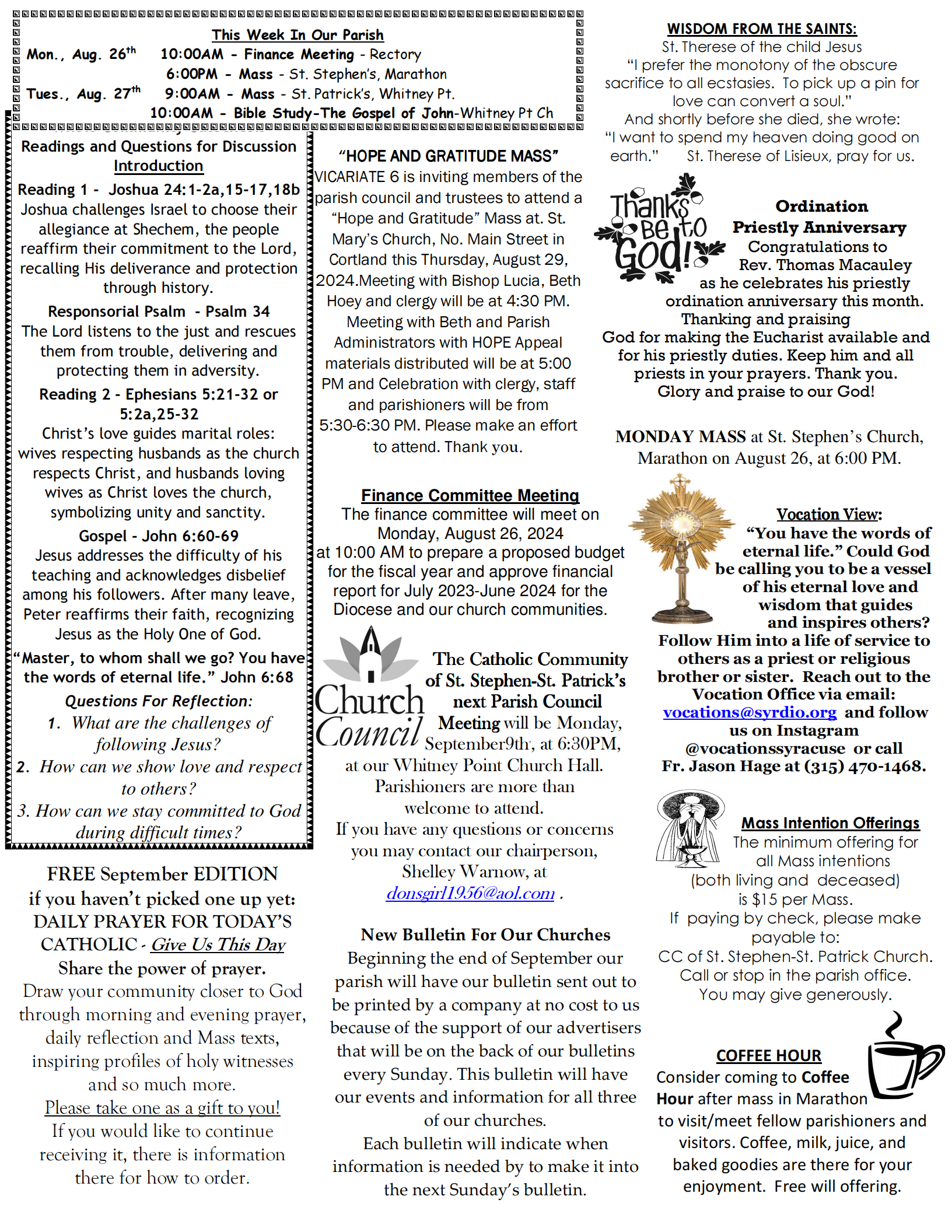 Catholic Community of St. Stephen & St. Patrick Church Bulletin For The Week Of August 25, 2024