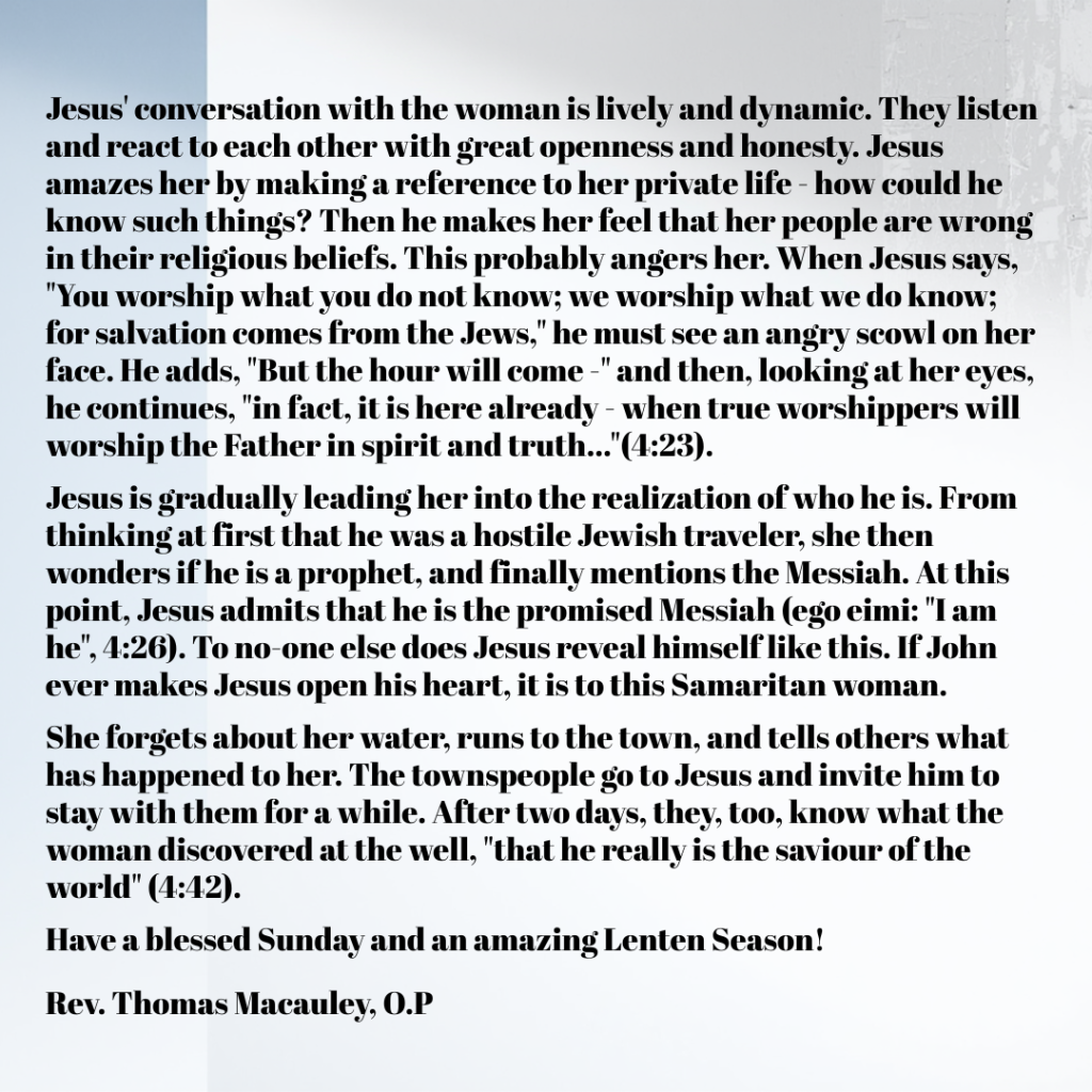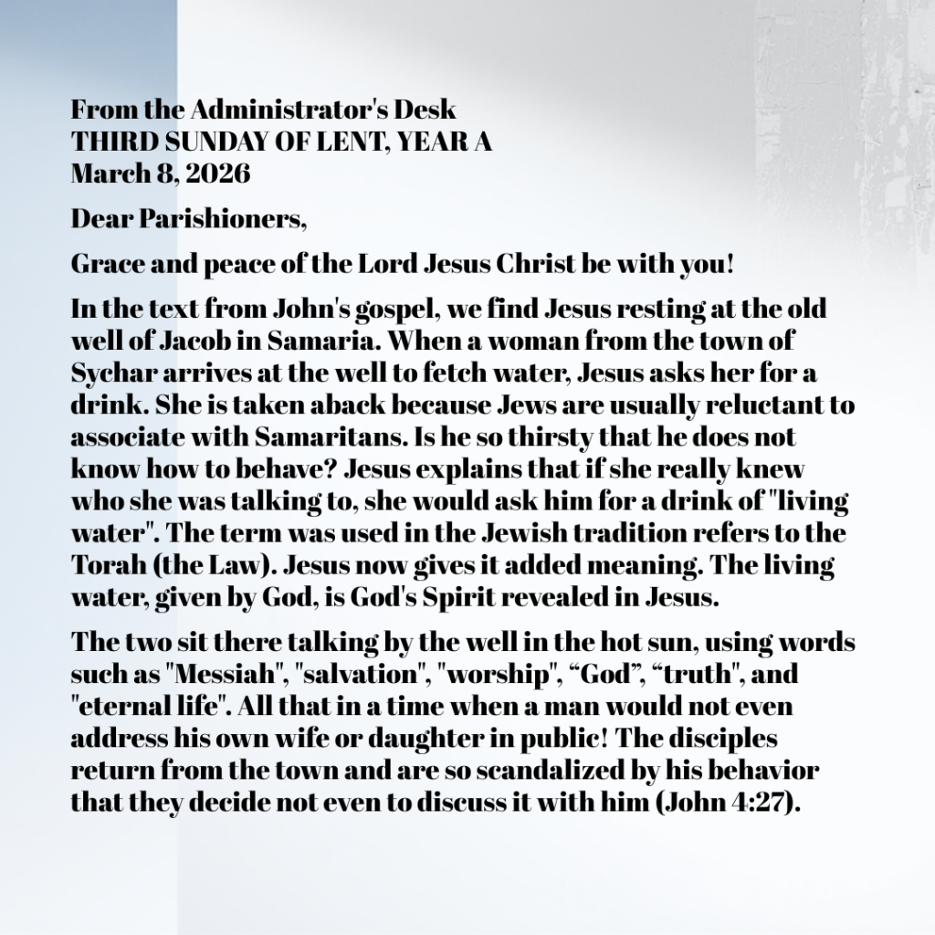 In the text from John’s gospel, we find Jesus resting at the old well of Jacob in Samaria. When a woman from the town of Sychar arrives at the well to fetch water, Jesus asks her for a drink. She is taken aback because Jews are usually reluctant to associate with Samaritans. Is he so thirsty that he does not know how to behave? Jesus explains that if she really knew who she was talking to, she would ask him for a drink of “living water”. The term was used in the Jewish tradition refers to the Torah (the Law). Jesus now gives it added meaning. The living water, given by God, is God’s Spirit revealed in Jesus.