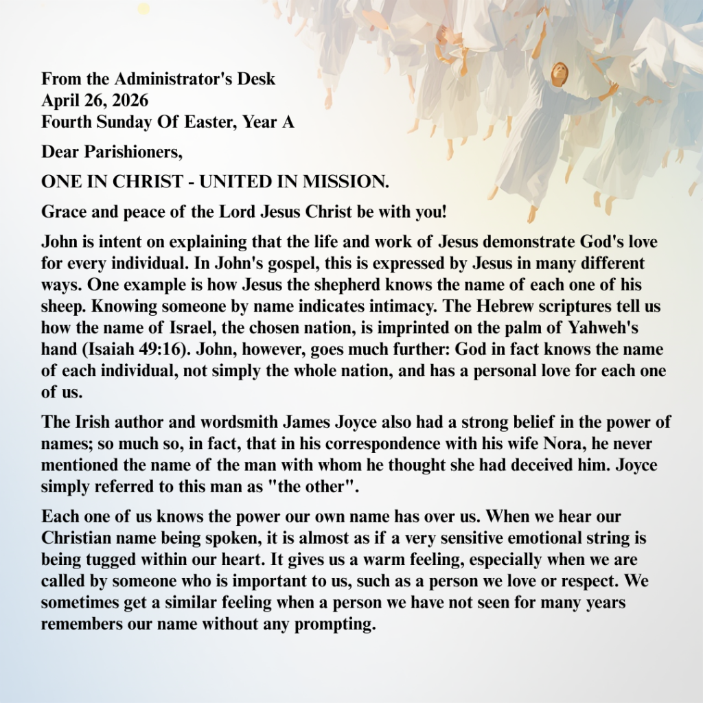 Each one of us knows the power our own name has over us. When we hear our Christian name being spoken, it is almost as if a very sensitive emotional string is being tugged within our heart. It gives us a warm feeling, especially when we are called by someone who is important to us, such as a person we love or respect. We sometimes get a similar feeling when a person we have not seen for many years remembers our name without any prompting.
