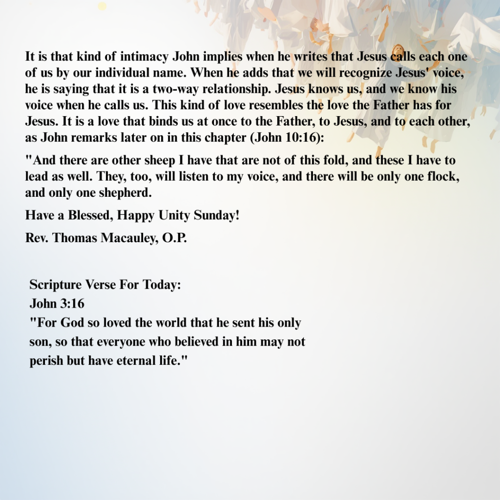 It is that kind of intimacy John implies when he writes that Jesus calls each one of us by our individual name. When he adds that we will recognize Jesus’ voice, he is saying that it is a two-way relationship. Jesus knows us, and we know his voice when he calls us. This kind of love resembles the love the Father has for Jesus. It is a love that binds us at once to the Father, to Jesus, and to each other, as John remarks later on in this chapter (John 10:16):