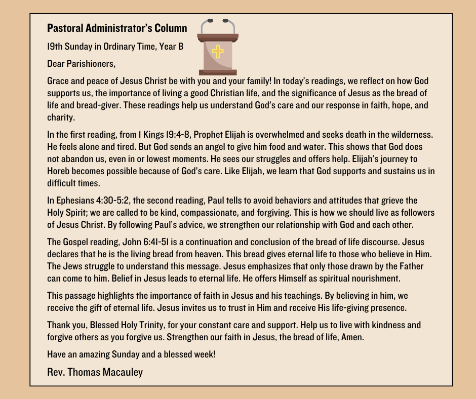 Grace and peace of Jesus Christ be with you and your family! In today’s readings, we reflect on how God supports us, the importance of living a good Christian life, and the significance of Jesus as the bread of life and bread-giver. These readings help us understand God’s care and our response in faith, hope, and charity.