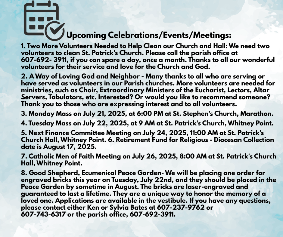 - Tuesday Mass on July 22, 2025, at 9 AM at St. Patrick’s Church, Whitney Point.