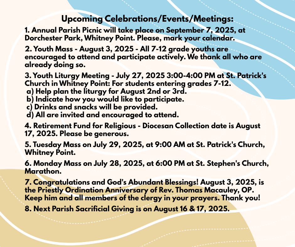 Youth Liturgy Meeting – July 27, 2025 3:00-4:00 PM at St. Patrick’s Church in Whitney Point: For students entering grades 7-12. a) Help plan the liturgy for August 2nd or 3rd. b) Indicate how you would like to participate. c) Drinks and snacks will be provided. d) All are invited and encouraged to attend.