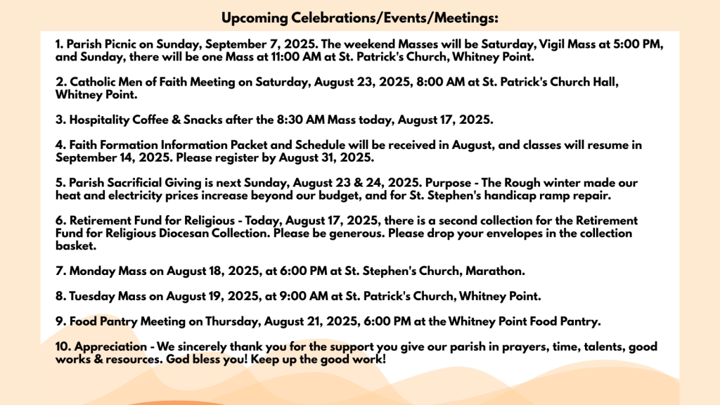 Retirement Fund for Religious – Today, August 17, 2025, there is a second collection for the Retirement Fund for Religious Diocesan Collection. Please be generous. Please drop your envelopes in the collection basket.
