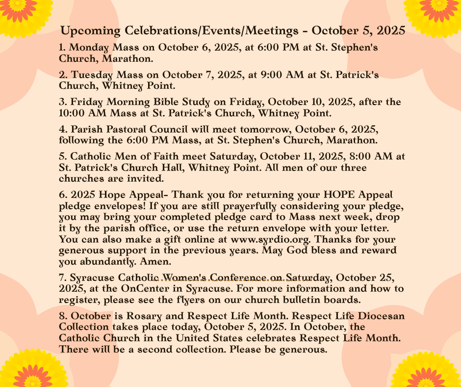 - Parish Pastoral Council will meet tomorrow, October 6, 2025, following the 6:00 PM Mass, at St. Stephen’s Church, Marathon.