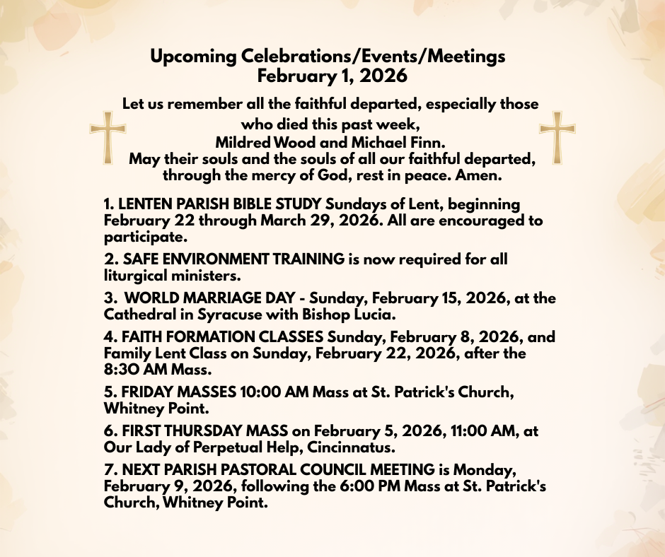 - NEXT PARISH PASTORAL COUNCIL MEETING is Monday, February 9, 2026, following the 6:00 PM Mass at St. Patrick’s Church, Whitney Point.