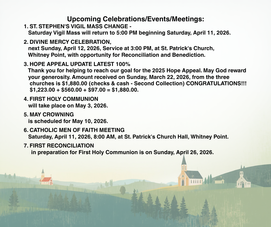 next Sunday, April 12, 2026, Service at 3:00 PM, at St. Patrick’s Church, Whitney Point, with opportunity for Reconciliation and Benediction. - НОРЕ APPEAL UPDATE LATEST 100%
