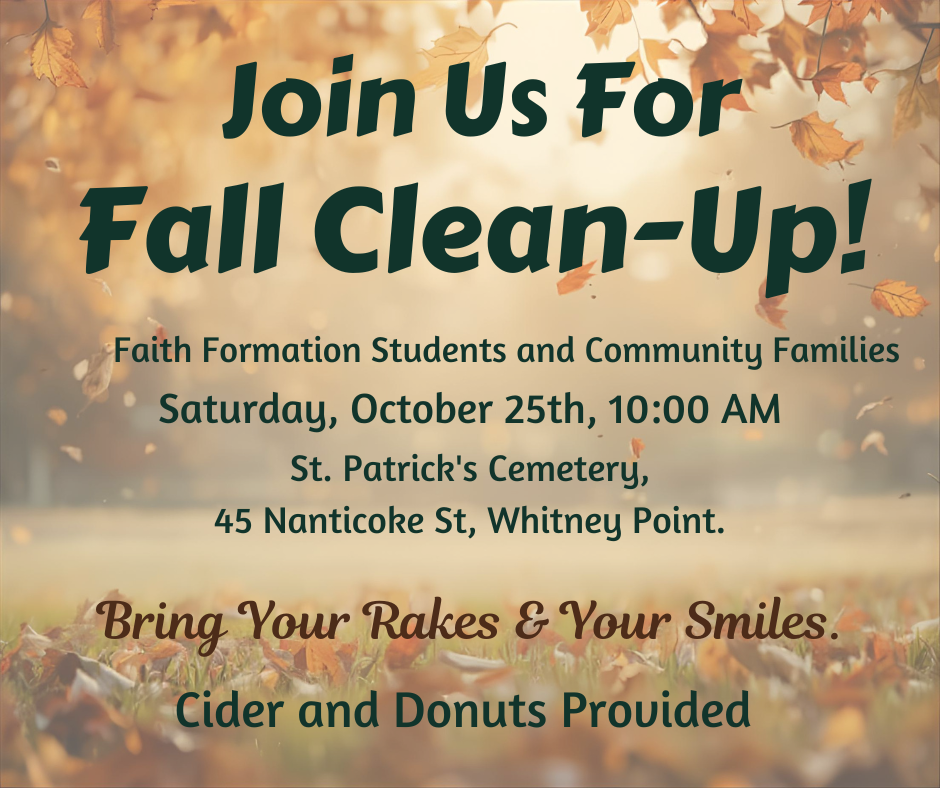 Saturday Morning – October 25th at 10:00 AM – Faith Formation Students – Service Project – Raking Leaves at St. Patrick’s Cemetery (45 Nanticoke St, Whitney Point, New York) – Bring The Family – All Are Welcome – Bring Extra Rakes