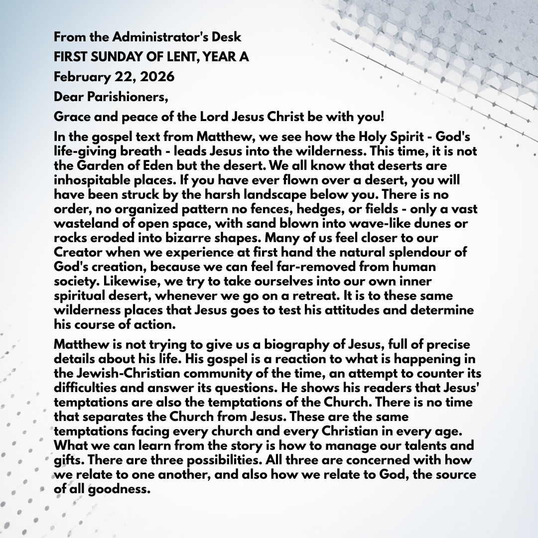 Matthew is not trying to give us a biography of Jesus, full of precise details about his life. His gospel is a reaction to what is happening in the Jewish-Christian community of the time, an attempt to counter its difficulties and answer its questions. He shows his readers that Jesus’ temptations are also the temptations of the Church. There is no time that separates the Church from Jesus. These are the same temptations facing every church and every Christian in every age. What we can learn from the story is how to manage our talents and gifts. There are three possibilities. All three are concerned with how we relate to one another, and also how we relate to God, the source of all goodness.