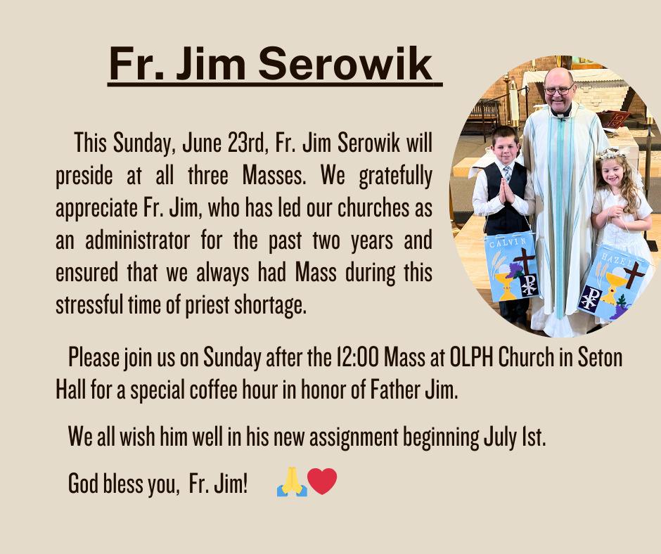 “This Sunday, June 23rd, Fr. Jim Serowik will preside at all three Masses. We gratefully appreciate Fr. Jim, who has led our churches as an administrator for the past two years and ensured that we always had Mass during this stressful time of priest shortage.