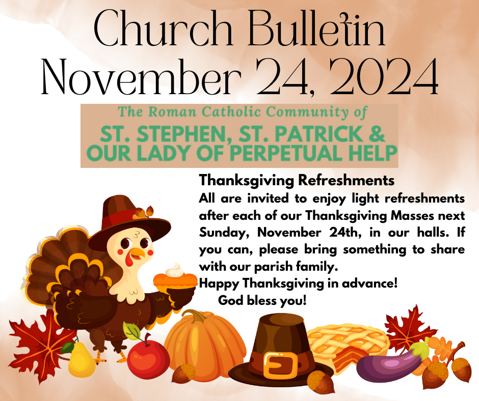 All are invited to enjoy light refreshments after each of our Thanksgiving Masses next Sunday, November 24th, in our halls. If you can, please bring something to share with our parish family.