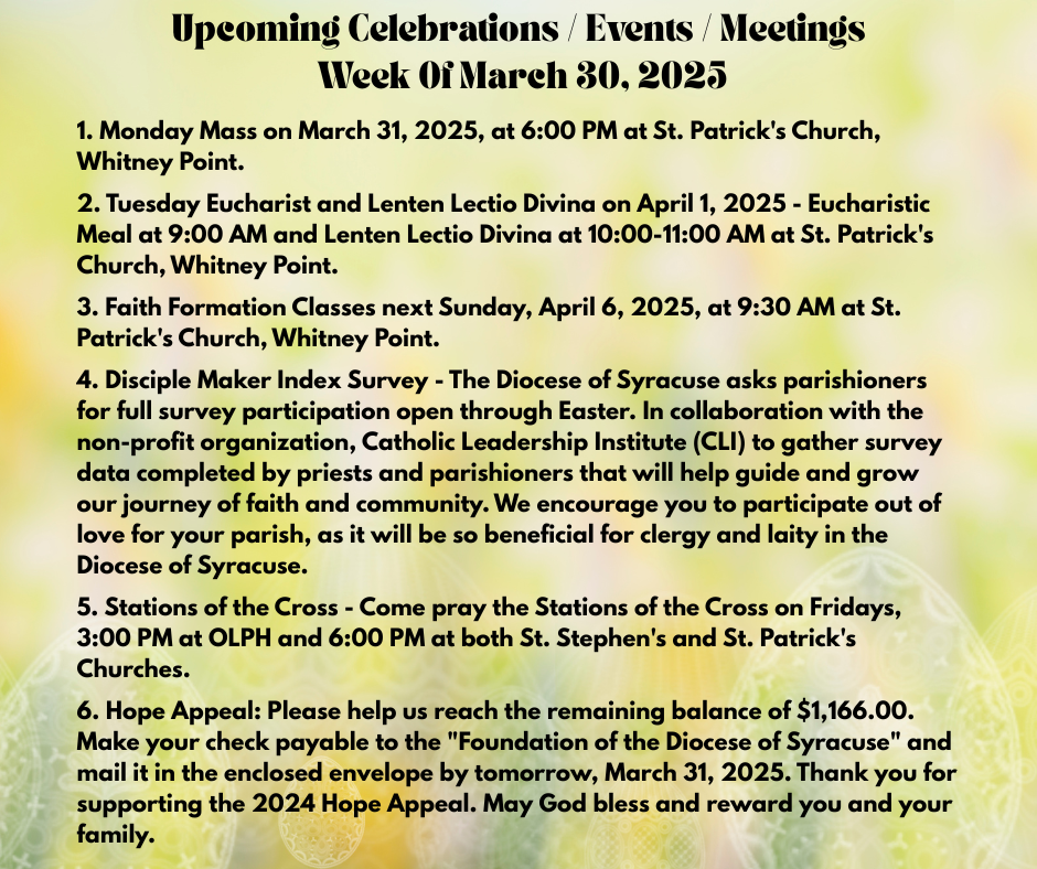- Monday Mass on March 31, 2025, at 6:00 PM at St. Patrick’s Church, Whitney Point.