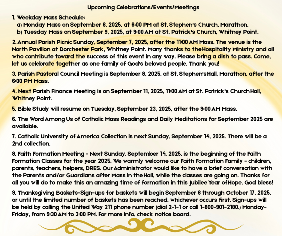 - Parish Pastoral Council Meeting is September 8, 2025, at St. Stephen’s Hall, Marathon, after the 6:00 PM Mass.