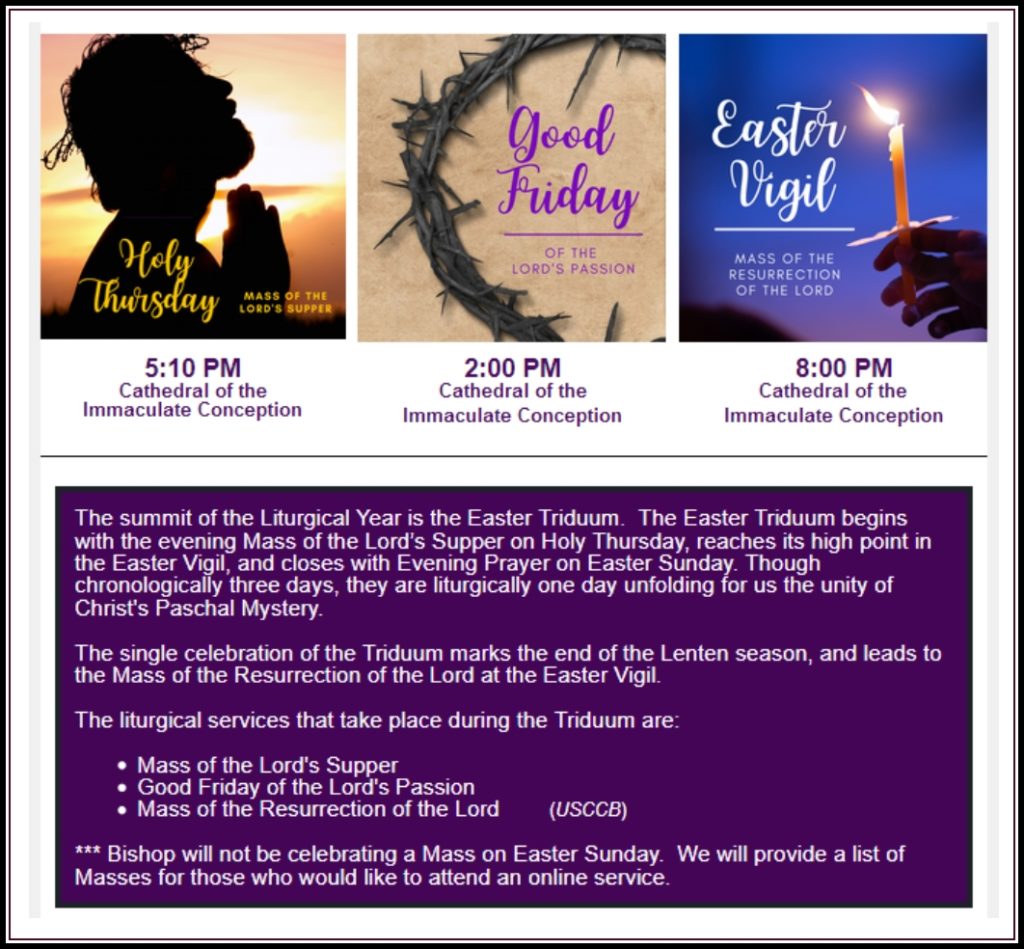 *** Bishop will not be celebrating a Mass on Easter Sunday. We will provide a list of Masses for those who would like to attend an online service.