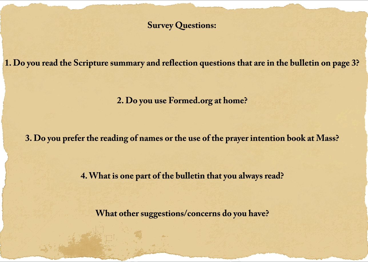 The Parish Council would like feedback concerning 4 topics. Therefore, we are going to distribute a 4 question survey before Mass this Sunday, February 2nd, that we would like everyone to complete.