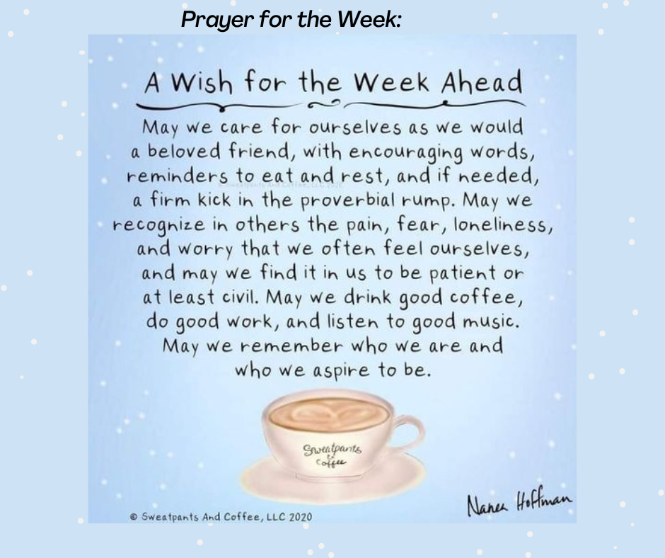 May we care for ourselves as we would a beloved friend, with encouraging words, reminders to eat and rest, and if needed, a firm kick in the proverbial rump. May we recognize in others the pain, fear, loneliness, and worry that we often feel ourselves, and may we find it in us to be patient or at least civil. May we drink good coffee, do good work, and listen to good music. May we remember who we are and who we aspire to be.