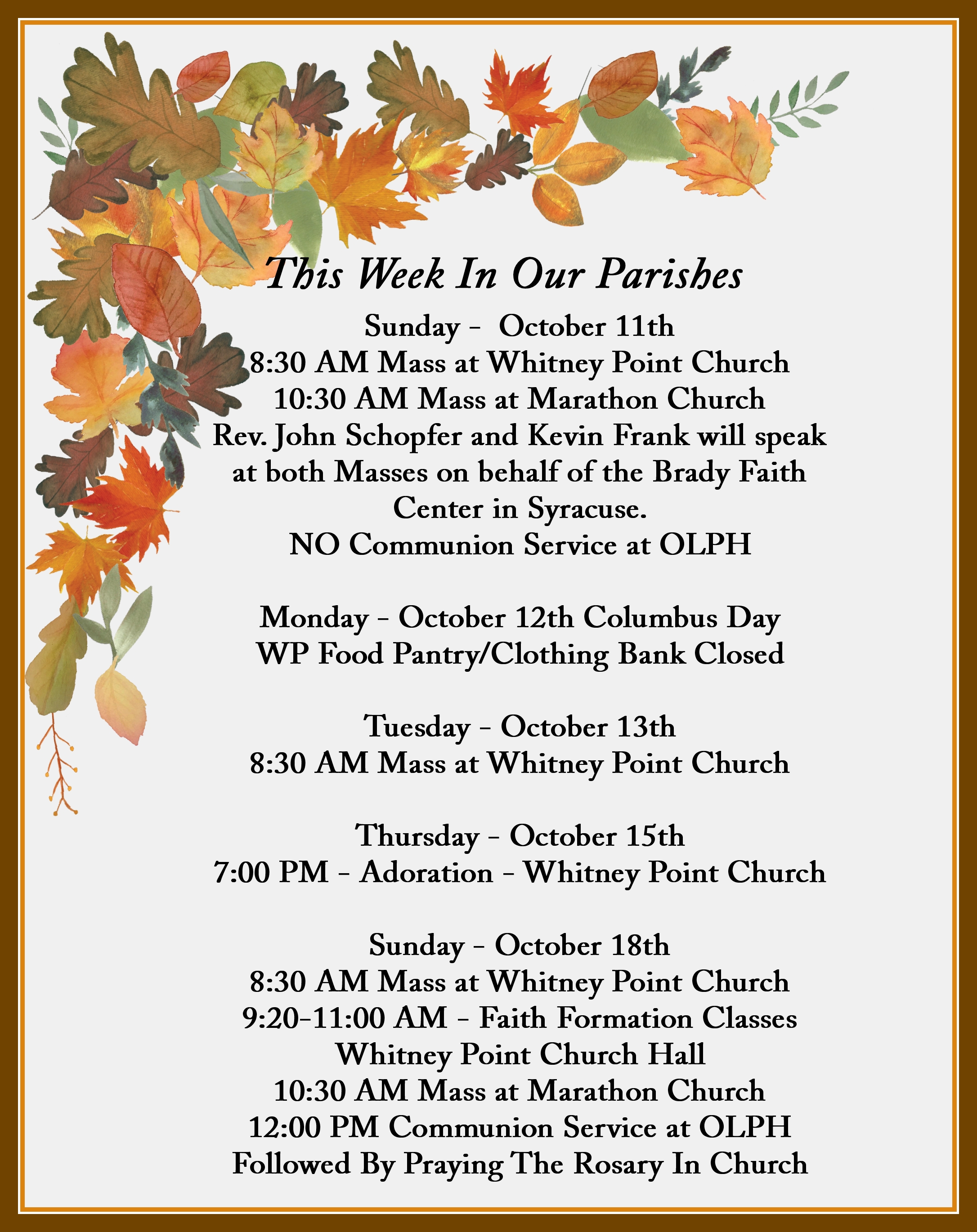 Masses on behalf of the Brady Faith Center in Syracuse. - NO Communion Service at OLPH