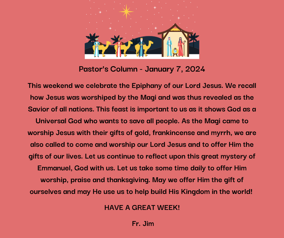 This weekend we celebrate the Epiphany of our Lord Jesus. We recall how Jesus was worshiped by the Magi and was thus revealed as the Savior of all nations. This feast is important to us as it shows God as a Universal God who wants to save all people. As the Magi came to worship Jesus with their gifts of gold, frankincense and myrrh, we are also called to come and worship our Lord Jesus and to offer Him the gifts of our lives. Let us continue to reflect upon this great mystery of Emmanuel, God with us. Let us take some time daily to offer Him worship, praise and thanksgiving. May we offer Him the gift of ourselves and may He use us to help build His Kingdom in the world!