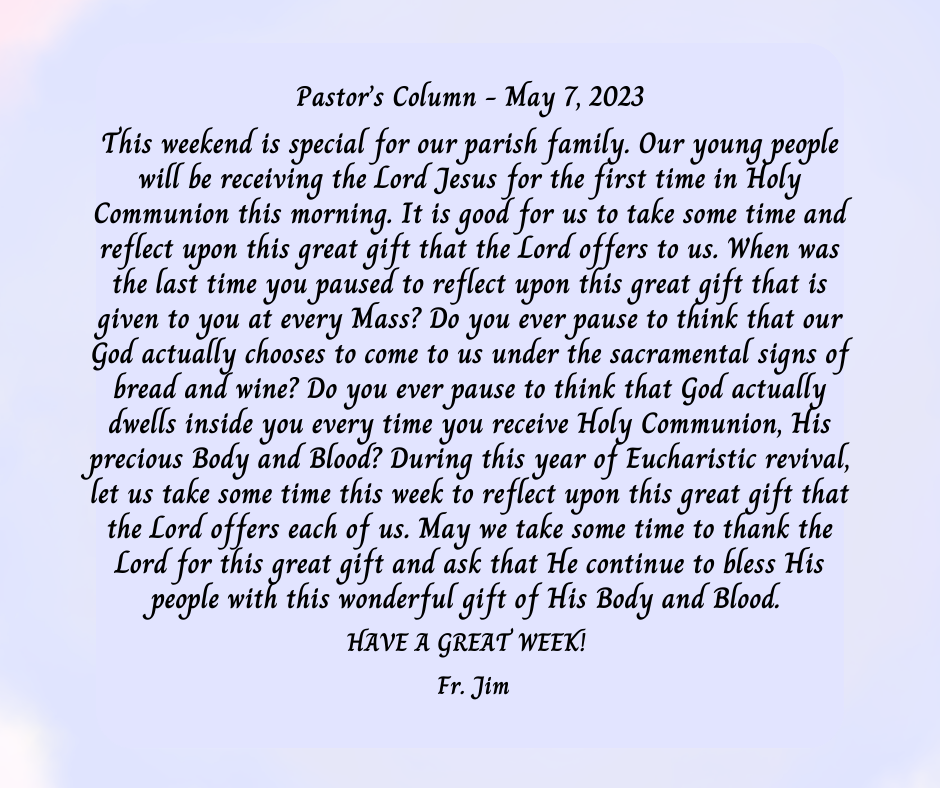 This weekend is special for our parish family. Our young people will be receiving the Lord Jesus for the first time in Holy Communion this morning. It is good for us to take some time and reflect upon this great gift that the Lord offers to us. When was the last time you paused to reflect upon this great gift that is given to you at every Mass? Do you ever pause to think that our God actually chooses to come to us under the sacramental signs of bread and wine? Do you ever pause to think that God actually dwells inside you every time you receive Holy Communion, His precious Body and Blood? During this year of Eucharistic revival, let us take some time this week to reflect upon this great gift that the Lord offers each of us. May we take some time to thank the Lord for this great gift and ask that He continue to bless His people with this wonderful gift of His Body and Blood.