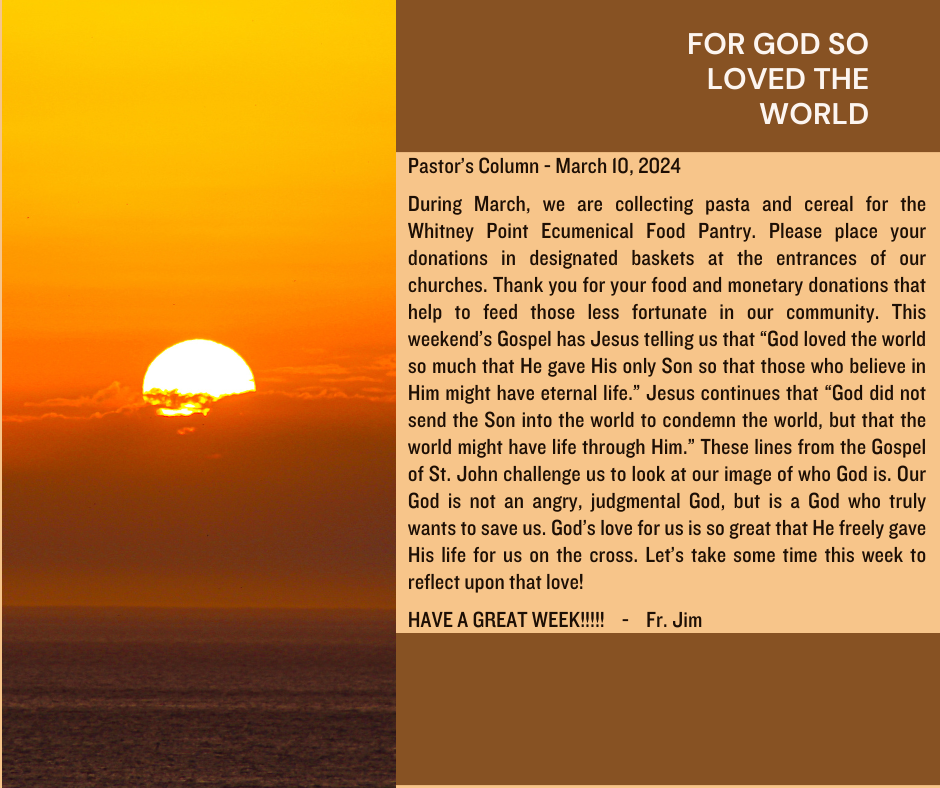During March, we are collecting pasta and cereal for the Whitney Point Ecumenical Food Pantry. Please place your donations in designated baskets at the entrances of our churches. Thank you for your food and monetary donations that help to feed those less fortunate in our community. This weekendโs Gospel has Jesus telling us that โGod loved the world so much that He gave His only Son so that those who believe in Him might have eternal life.โ Jesus continues that โGod did not send the Son into the world to condemn the world, but that the world might have life through Him.โ These lines from the Gospel of St. John challenge us to look at our image of who God is. Our God is not an angry, judgmental God, but is a God who truly wants to save us. Godโs love for us is so great that He freely gave His life for us on the cross. Letโs take some time this week to reflect upon that love!