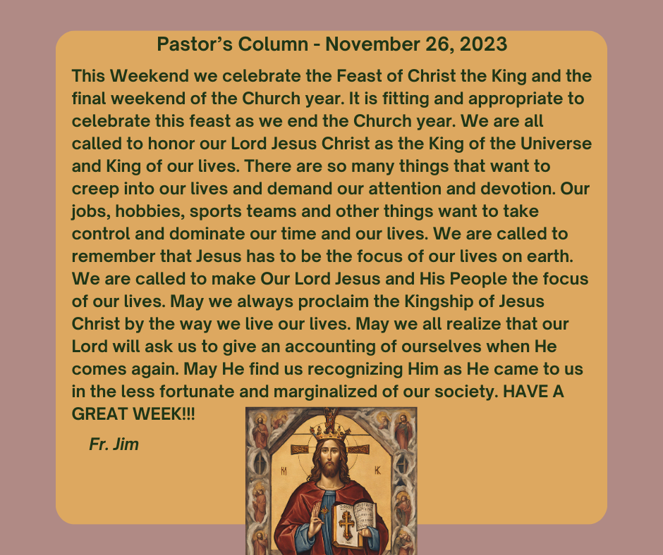 This Weekend we celebrate the Feast of Christ the King and the final weekend of the Church year. It is fitting and appropriate to celebrate this feast as we end the Church year. We are all called to honor our Lord Jesus Christ as the King of the Universe and King of our lives. There are so many things that want to creep into our lives and demand our attention and devotion. Our jobs, hobbies, sports teams and other things want to take control and dominate our time and our lives. We are called to remember that Jesus has to be the focus of our lives on earth. We are called to make Our Lord Jesus and His People the focus of our lives. May we always proclaim the Kingship of Jesus Christ by the way we live our lives. May we all realize that our Lord will ask us to give an accounting of ourselves when He comes again. May He find us recognizing Him as He came to us in the less fortunate and marginalized of our society. HAVE A GREAT WEEK!!!