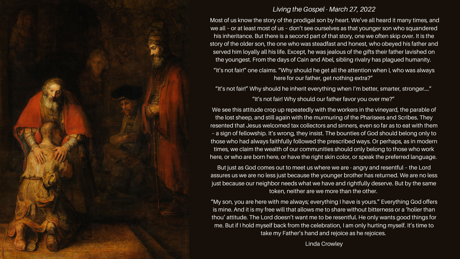 But just as God comes out to meet us where we are – angry and resentful – the Lord assures us we are no less just because the younger brother has returned. We are no less just because our neighbor needs what we have and rightfully deserve. But by the same token, neither are we more than the other.