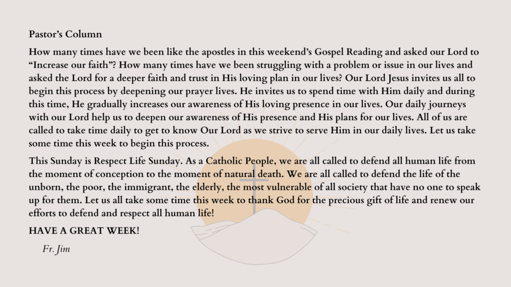 How many times have we been like the apostles in this weekend’s Gospel Reading and asked our Lord to “Increase our faith”? How many times have we been struggling with a problem or issue in our lives and asked the Lord for a deeper faith and trust in His loving plan in our lives? Our Lord Jesus invites us all to begin this process by deepening our prayer lives. He invites us to spend time with Him daily and during this time, He gradually increases our awareness of His loving presence in our lives. Our daily journeys with our Lord help us to deepen our awareness of His presence and His plans for our lives. All of us are called to take time daily to get to know Our Lord as we strive to serve Him in our daily lives. Let us take some time this week to begin this process.