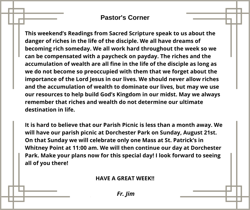 It is hard to believe that our Parish Picnic is less than a month away. We will have our parish picnic at Dorchester Park on Sunday, August 21st. On that Sunday we will celebrate only one Mass at St. Patrick’s in Whitney Point at 11:00 am. We will then continue our day at Dorchester Park. Make your plans now for this special day! I look forward to seeing all of you there!